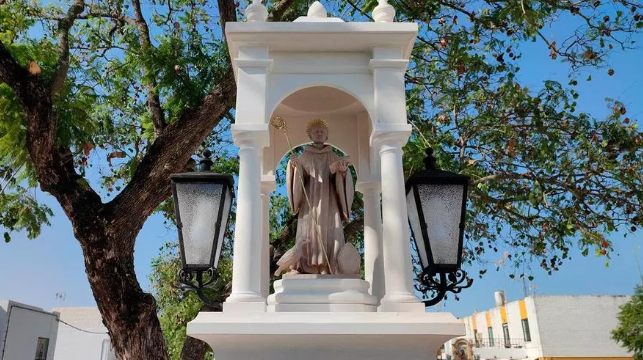 Conmemora el octavo centenario de su canonización, así como el décimo aniversario de su nombramiento como Alcalde Perpetuo de la localidad. Se alza sobre un pedestal, en el que se lee la inscripción “Bendito Padre y Patrón nuestro. 11 de julio de 2021” – una columna sobre la que se erige un templete que cobija la imagen del Patrón de Castilblanco, que reproduce la iconografía con la que es venerado en su ermita de la sierra, y escoltado por dos faroles que le dan luz.